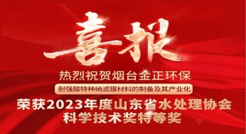 煙臺金正環保耐酸特種納濾膜科研成果榮獲山東省水處理協會科學技術獎特等獎